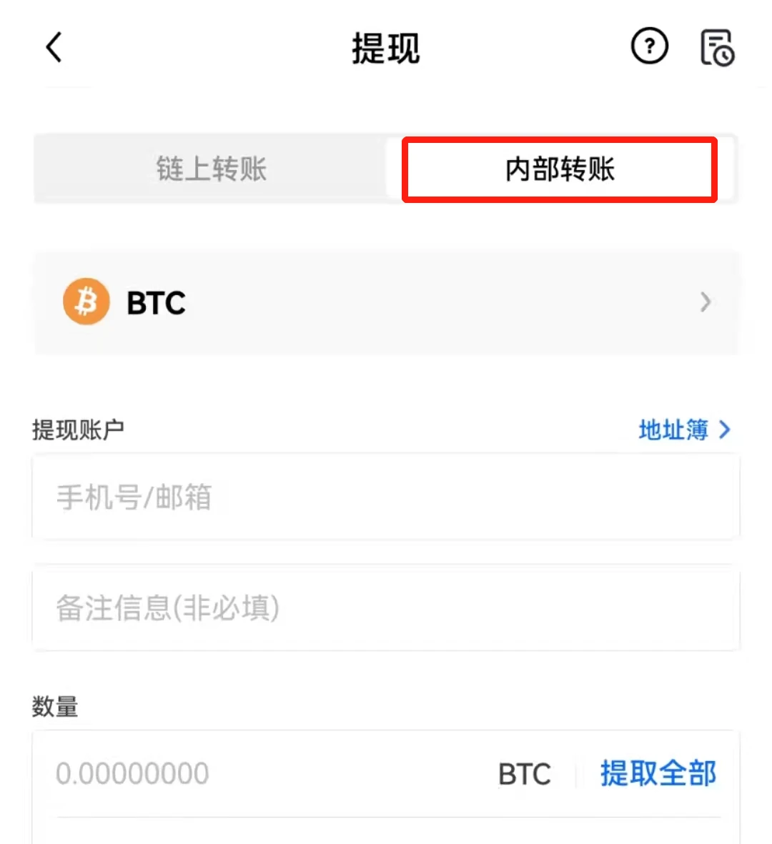 3. 若进行内部转账需要输入提现账户、提币数量。内部转账仅限同为欧意平台用户之间进行操作。