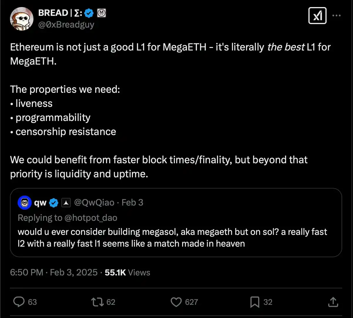 以太坊的流动性和 TVL 使它成为 L2 更好的平台。此外,以太坊明确地在性能和可用性之间做出了权衡,这对于 L2 来说是一个更好的选择,因为 L2 不需要 L1 上的高吞吐量。L2 最怕的情况是,当 L1 离线时,无法完成交易或桥接。
