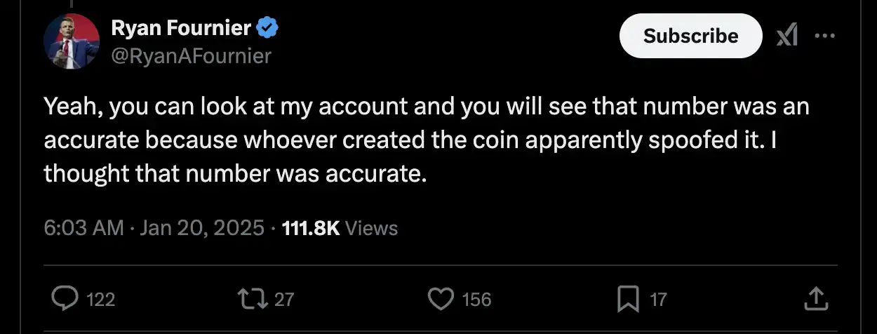Fournier 还反复坚称自己是加密货币领域的新手,一些术语令其感到困惑。「你正在和一个加密货币领域的新手交谈。我甚至都不知道我是否能卖出什么东西。」Fournier 在 X Space 中否认从销售中获利,声称他在购买然后出售代币后「几乎处于亏损状态」。他还在 X 上发帖表示,未来将远离加密货币,直到更好地了解该信任谁,因为他期待为特朗普总统的新政府工作。然而,在 Space 中,他却吹嘘自己与特朗普的加密货币顾问有联系。
