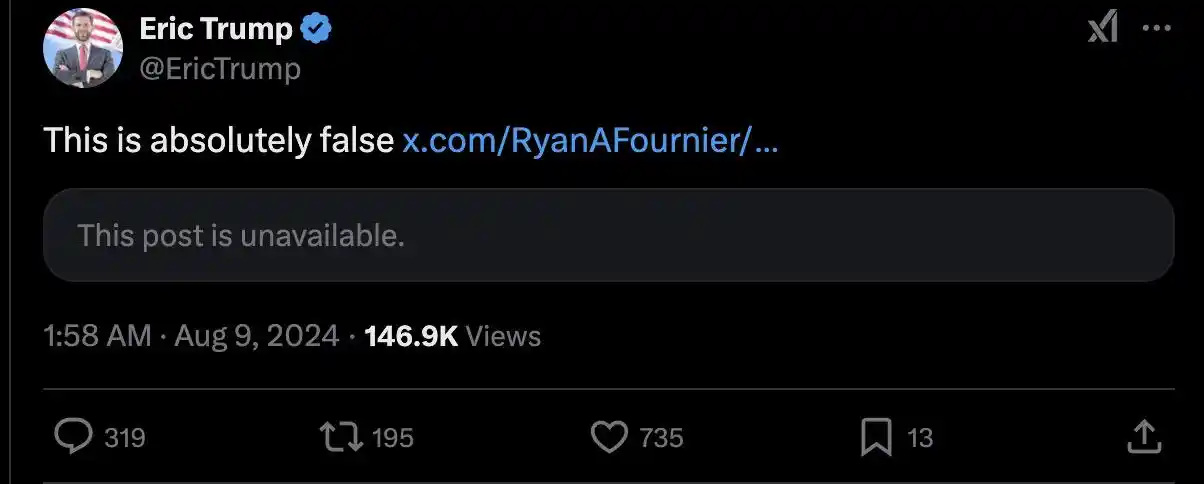埃里克·特朗普发现该谣传后,在 X 上坚决否认该代币与他们家族有任何联系,并谴责了 Fournier。谣言一得到澄清,RTR 的代币价格旋即暴跌了 95%。而 Fournier 与 @SizeChad 也都删除了此前发布的宣传该代币的推文。