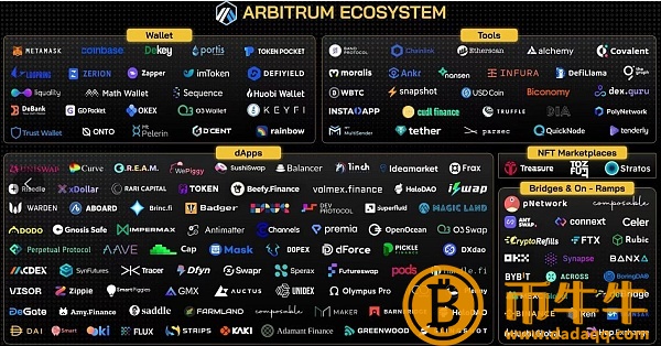 生态建设:Arbitrum生态建设板块涉及钱包、互换、借贷、期权、NFTs、NFT市场、工具、桥梁、道工具等20个板块。,而且生态非常繁荣。下图中我们可以看到阿尔比特鲁姆的一些重点生态项目。
